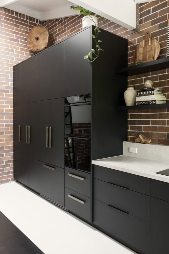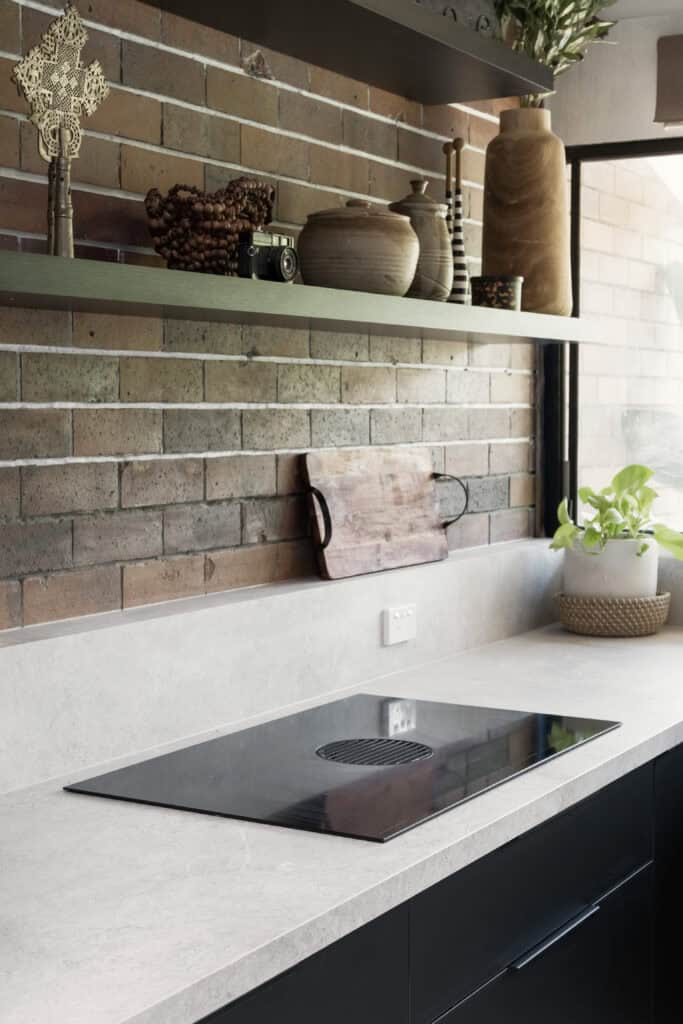 This commitment to a clutter-free soul extends to the technical heart of the kitchen. We opted for a seamless Fisher & Paykel Series 9 Induction Cooktop, featuring integrated ventilation that eliminates the need for a bulky overhead rangehood. This clever integration freed the wall for two floating Polytec Black Woodmatt shelves that complement the home’s brick and timber accents, allowing the clients to personalize the space with greenery and curated pieces. This minimalist cooktop is paired with an Abey Piazza Black Pearl double square bowl sink and a complimenting pull-out dual spray mixer. By integrating all major appliances behind the cabinetry, the kitchen presents as a singular, architectural piece rather than a utility room – allowing 21st-century minimalism to sit in quiet, perfect harmony with the home’s rugged 1970s character.