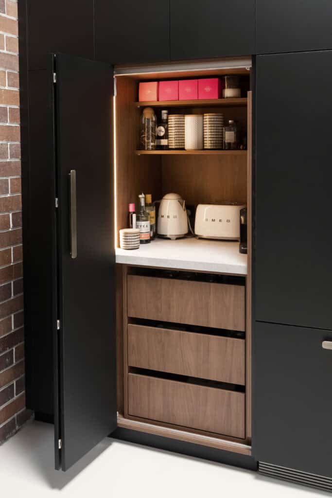 While the exterior provides a bold, obsidian shell, the interior of the multi-purpose appliance pantry offers a moment of unexpected warmth. We specified Florentine Walnut internals to provide a rich, tactile contrast for when the door is left opened. This choice ensures the cabinetry isn’t just a dark monolith, but a layered piece of joinery where the deep, honeyed tones of the walnut echo the earthy soul of the Bardon heritage. By pairing this moody base with crisp, minimal porcelain above, we created a high contrast “tonal sandwich.” This clean break allows the bright white surfaces to pop while the dark timber core provides the gravity needed to hold the room together.