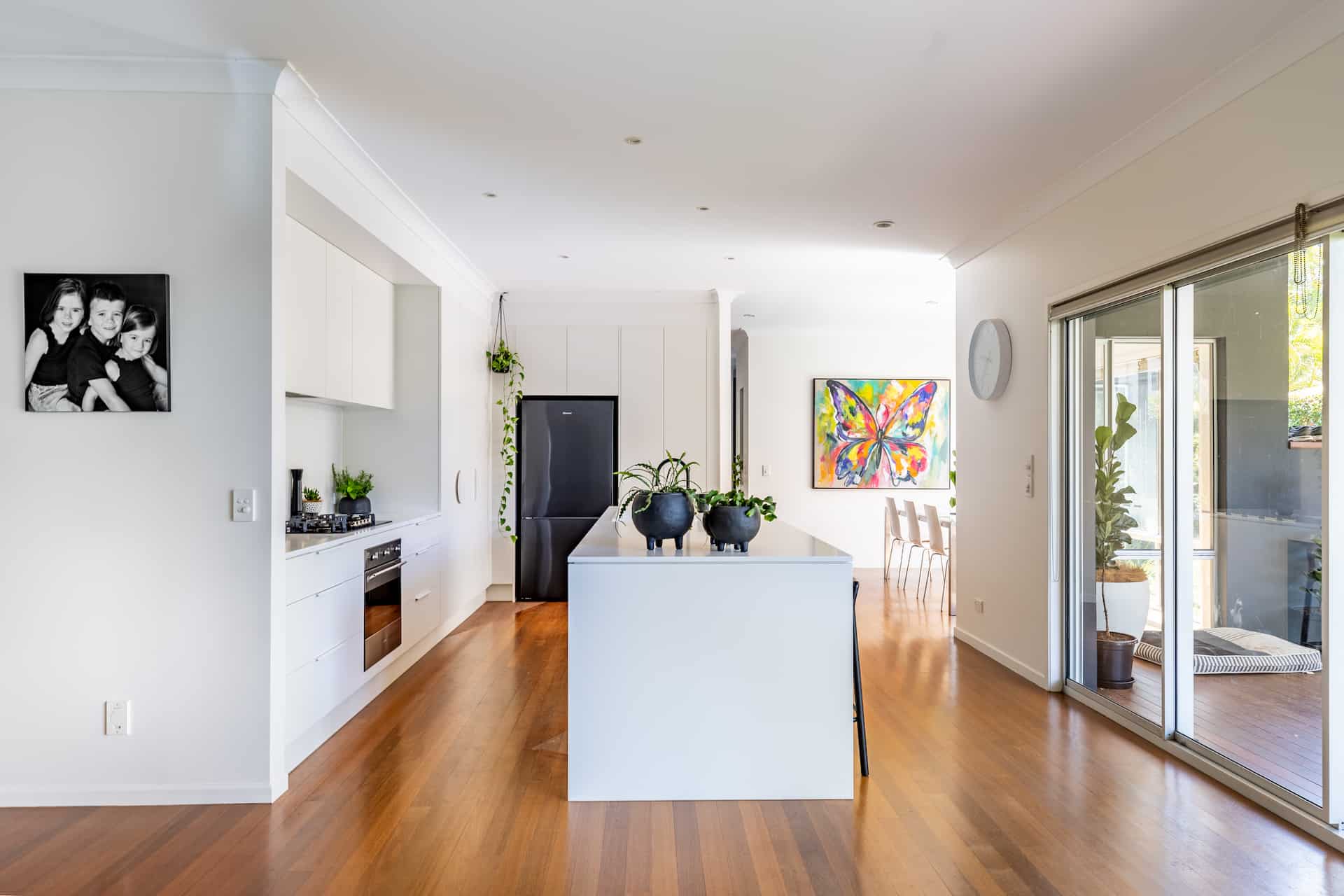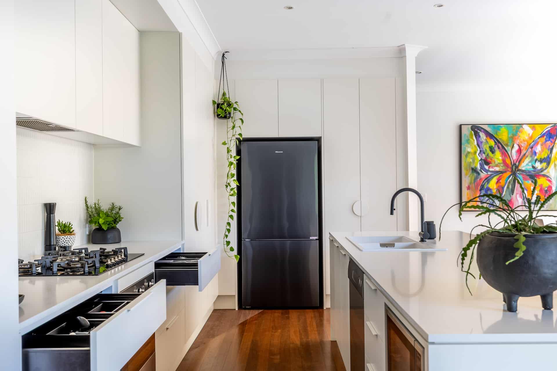 We achieved this by extending a wall forward, squaring off the cabinetry / island and custom building triangle shaped boxes behind the tall doors. It has created a beautiful contemporary space with functionality.